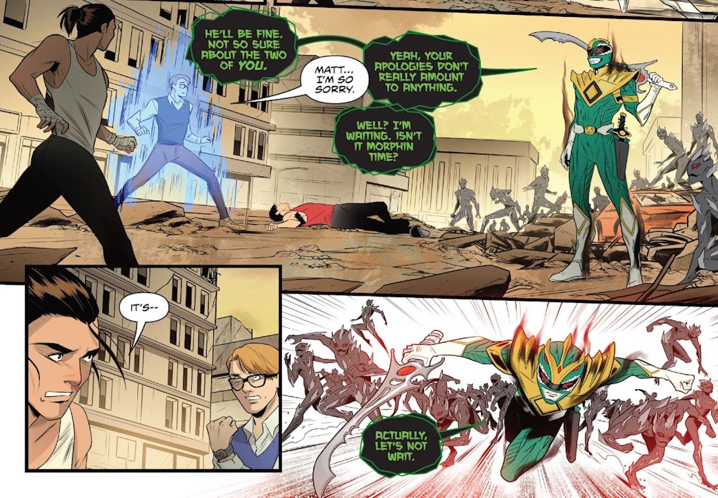 Advertencia: Spoilers de Mighty Morphin Power Rangers #107una vieja escuela Guardabosques El tropo finalmente se subvierte en una debilidad durante el combate, gracias al nuevo Green Ranger malvado. Introducido en el Vamos, Power Rangers serie como un amigo de la escuela secundaria de los Rangers, Matthew Cook se ha convertido desde entonces en el nuevo Green Ranger, inicialmente trabajando para la organización Promethea de la ex Red Ranger Grace Sterling antes de unirse al equipo de Zordan. Más recientemente, Matthew fue capturado y torturado por Rita Repulsa por segunda vez en su vida, resurgiendo como un secuaz controlado mentalmente por la rebautizada Mistress Vile.