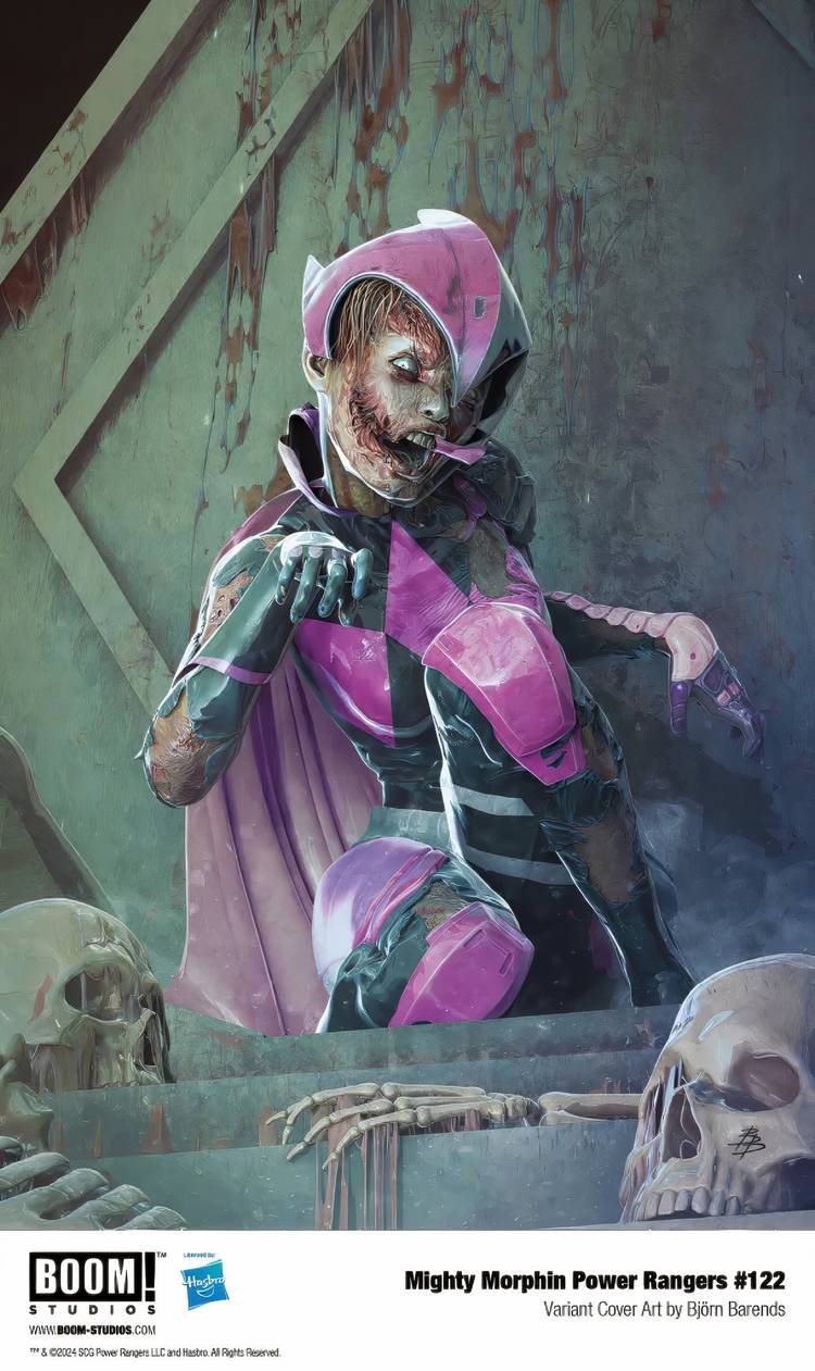 En un avance compartido por AIPT Comics para Mighty Morphin Power Rangers #122 de Melissa Flores y Simona Di Gianfelice, los fans pueden ver una nueva portada variante para el próximo número del artista Björn Barends. La portada presenta una versión horriblemente zombificada de la Ranger Rosa de Kimberly Hart, con armadura rota, carne podrida, ojos sin alma y una cara mutilada. La cicatriz retorcida que se extiende desde su boca hasta el costado de su mejilla como una especie de sonrisa infernal es especialmente inquietante y decididamente demasiado oscura para la televisión.