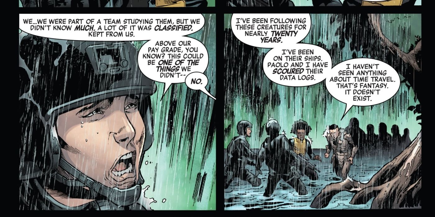 Cuando estas personas se dan cuenta de que han sido desplazadas en el tiempo, algunas empiezan a asustarse. Tenían familia, seres queridos, y ahora nunca los volverán a ver porque es muy probable que sus hijos sean mayores que ellos en este momento. Sin embargo, uno de ellos comienza a contemplar la idea del viaje en el tiempo, que no fueron tomados en su período de tiempo original y mantenidos en estasis hasta ahora, pero que los Yautja tienen la capacidad de viajar en el tiempo. Esta sugerencia estaba llena de esperanza, ya que significaba que podían volver a su tiempo original después de sobrevivir a esta cacería alienígena. Pero, lamentablemente, esa idea fue derribada de inmediato, y se quedaron con la fría verdad de que les han robado la vida, sobrevivan o no a este lugar. Esto es interesante porque, por lo general, el viaje en el tiempo es lo único que crea una serie de problemas horribles para el protagonista y su mundo en cualquier historia de ciencia ficción que lo presente. Pero aquí, su ausencia es mucho peor que la esperanza que traería el viaje en el tiempo si estuviera incluido en este Depredador cómic.