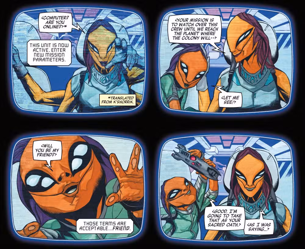 En realidad, los lectores conocen a los K’shorrik directamente, a través de registros de video grabados de un grupo de especies que viajan por el espacio (hasta que un evento crítico los pone en estasis, esperando ayuda para su nave estrellada). Y a primera vista, son inmediatamente una nueva faceta en el canon cinematográfico. Bípedos, de cuatro brazos, criadores de niños, pero listos para el combate, los K’shorrik parecen equipados para sobrevivir entre las estrellas.