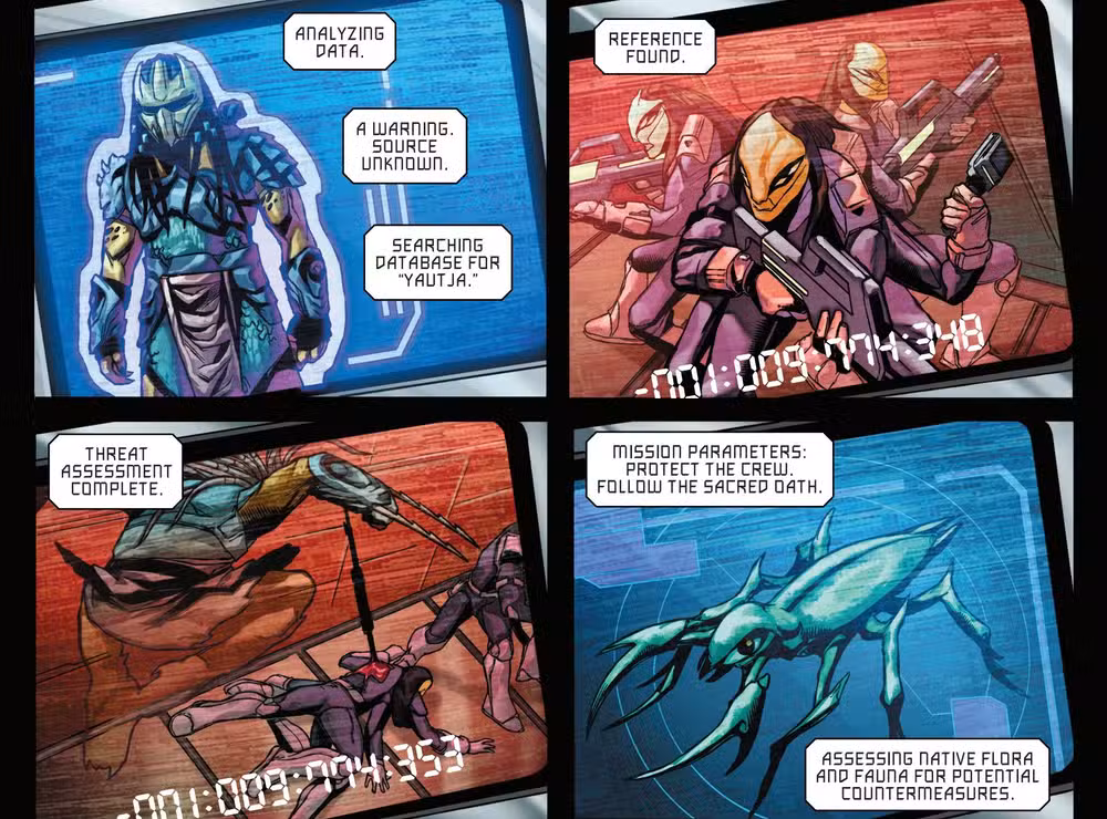 Lo que también significa que Dek no está en absoluto preparado para el tipo de combate que la IA es capaz de realizar. Olvídese de espadas, lanzas o incluso armas láser de Yautja. La inteligencia K’shorrik utiliza feromonas para poner a la fauna nativa en contra de Dek, antes de construir y cargar su conciencia en un robot “Yautja Killer” en toda regla. Y lo hace en cuestión de minutos, como máximo.