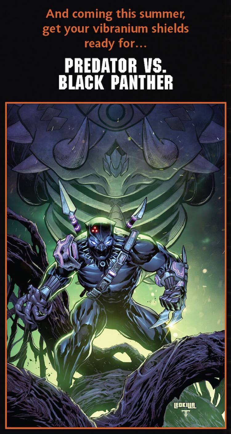 Mientras la especie Predator continúa su búsqueda de los recursos más poderosos del Universo Marvel, Black Panther debe luchar contra los hijos del Rey Predator para proteger Wakanda. Con la mejora del vestuario de T’Challa vislumbrada al final de Depredador: La última cazatiene garras que combinan con las de Yautja junto con nueva tecnología y lanzas que brillan con energía púrpura. Los últimos lectores vieron a un Depredador luchando contra un héroe de Marvel en Depredador contra Wolverine y la bestia alienígena codiciaba el adamantium de Wolverine. En busca del trofeo definitivo para su caza, los nuevos Yautja tienen sus miras térmicas puestas en el vibranio de Wakanda.