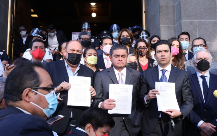 Los líderes de las fracciones parlamentarias del PAN, PRD y PRI, Jorge Romero, Luis Ángel Espinosa Cházaro y Rubén Moreira Valdés, respectivamente, indicaron que entregaron 233 firmas, las cuales son suficientes para que se admita a trámite la queja.