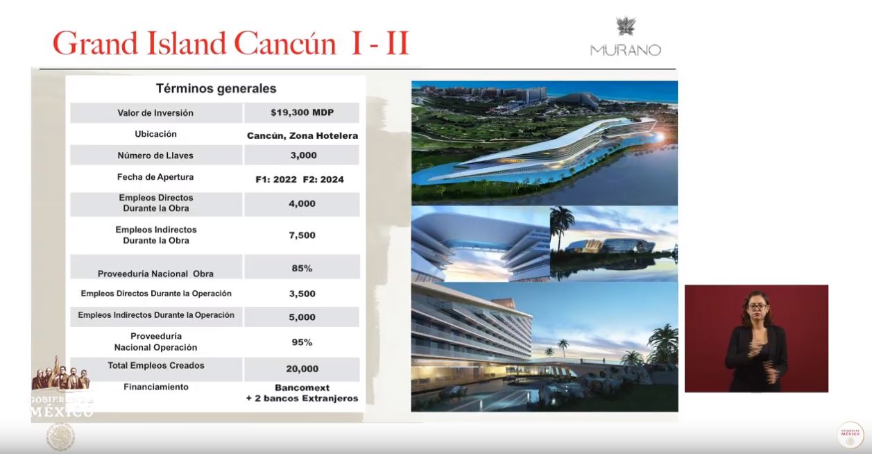 En tanto, Marcos Sacal, director general de Murano, detalló que el proyecto hotelero será de tres mil habitaciones en Cancún y que este representará una inversión aproximada de mil millones de dólares en dos fases: la primera en 2022 y la segunda en 2024.