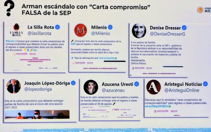 Aunque no se mencionó al medio, como parte de la sección “Quién es quién en las mentiras” se mostró en pantalla de Palacio Nacional -en una diapositiva que después se envió a todos los medios- el logotipo y una nota de Aristegui Noticias, titulada Descarga aquí la verdadera “carta compromiso de corresponsabilidad” para regreso a clases presenciales.