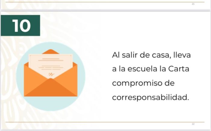 En el comunicado “conjunto no. 23”, adjunto a la carta enviada a todos los medios, se informó que “las autoridades educativas federal y de las 32 entidades del país… aprobaron que madres, padres de familia o tutores que decidan enviar voluntariamente a sus hijas e hijos a la escuela, y educandos mayores de edad, deberán firmar una carta compromiso de asistencia voluntaria y corresponsabilidad que será entregada a la autoridad escolar correspondiente”.