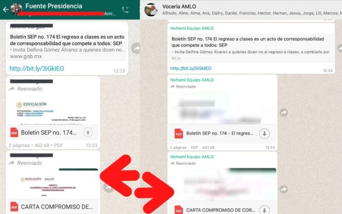 En dos chats de la Presidencia y Comunicación Social de la SEP difundieron la “carta compromiso”, la misma que difundió Aristegui Noticias un día antes: