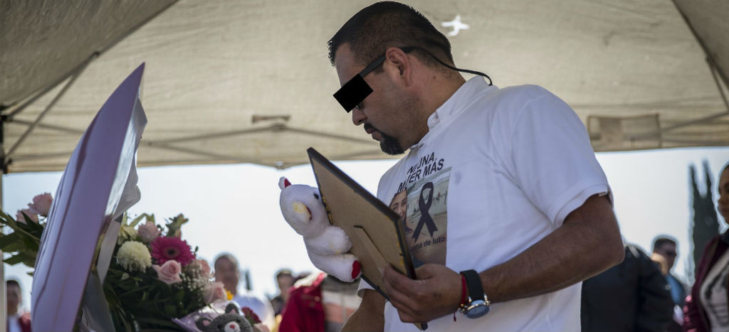 Con cientos de flores y una playera con la leyenda “Ni una mujer más”, el acusado llegó a la ceremonia luctuosa y se acercó al féretro abierto para dar el último adiós a la joven.