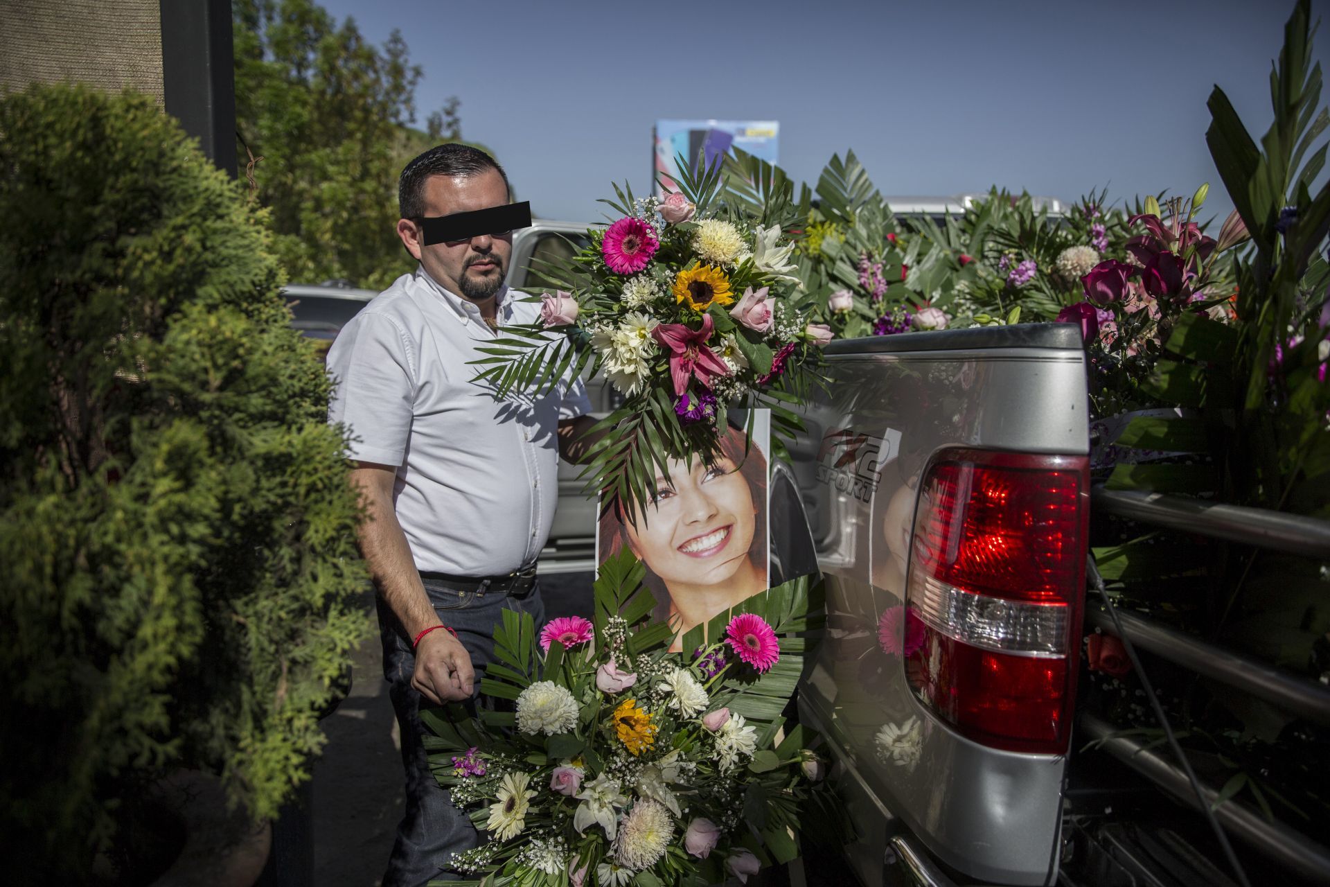 Con cientos de flores y una playera con la leyenda “Ni una mujer más”, el acusado llegó a la ceremonia luctuosa y se acercó al féretro abierto para dar el último adiós a la joven.
