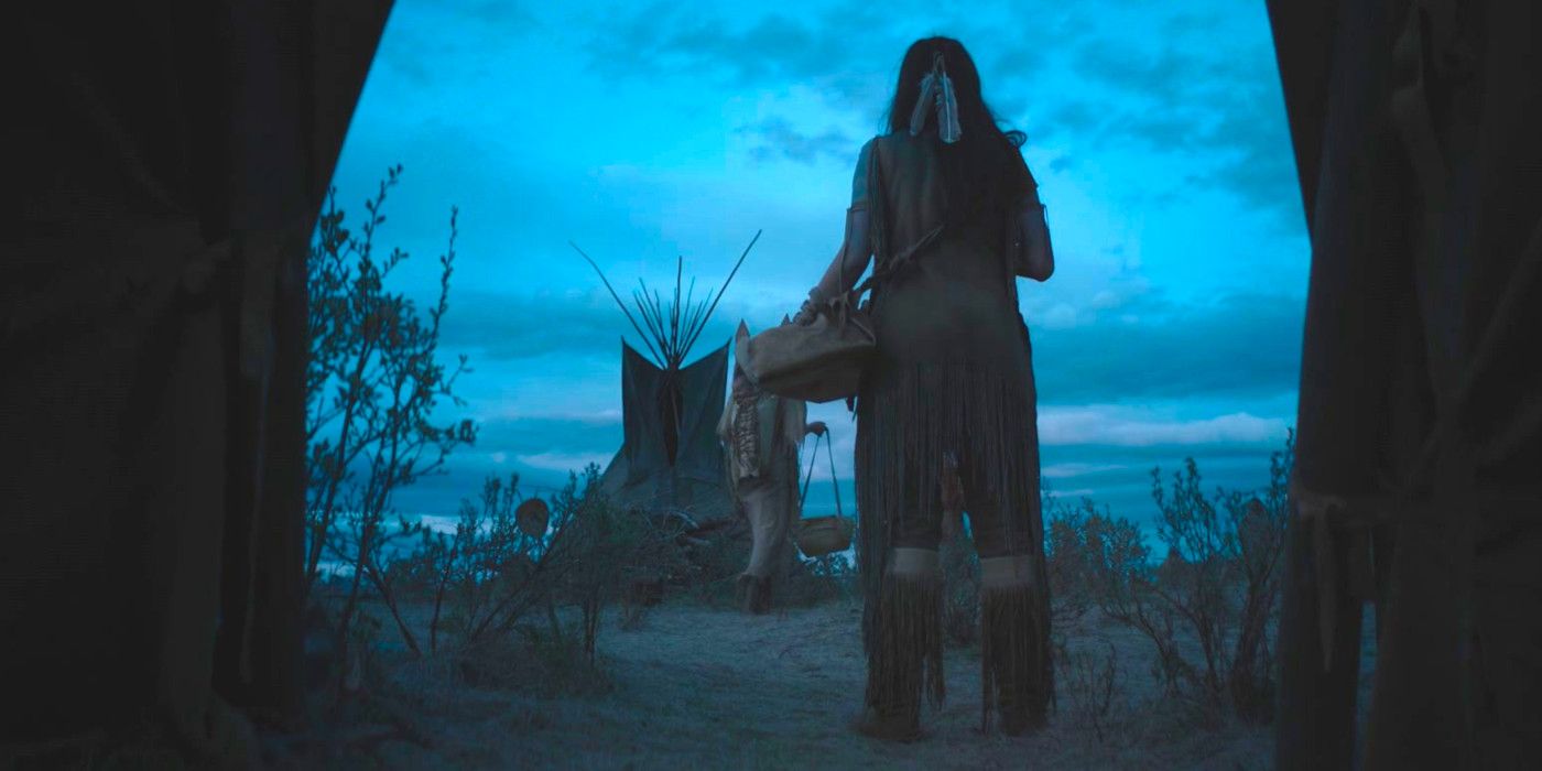 el tiro en Presa que se refiere a la Buscadores La toma llega al principio de la película, cuando se ve a Naru de Amber Midthunder enmarcada en la entrada de una tienda de campaña. Sin embargo, este levantamiento de Ford no pretende ser un tributo amoroso, sino más bien un comentario sobre Los buscadoresuna película ampliamente considerada racista por su descripción del pueblo comanche.