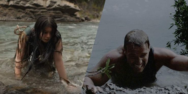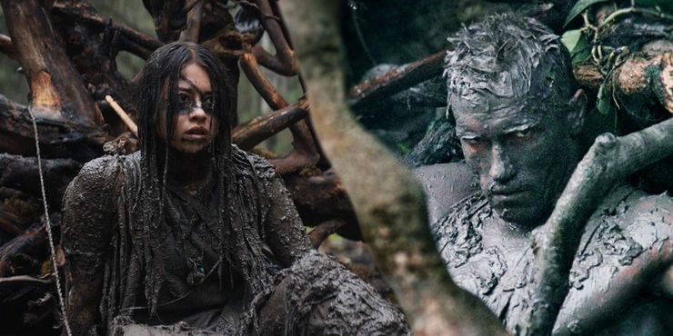Cuando Naru descubre inicialmente el pozo de lodo en el bosque, es absorbida por él y casi se ahoga. Ella usa su tomahawk con una cuerda atada para salir, cubierta de barro y luciendo mucho como el holandés de Arnold Schwarzenegger desde el principio. Depredador cuando descubre que el barro se puede usar para camuflarse de la criatura. Las ramas de los árboles contra las que se apoya Naru después de salir crean una referencia casi perfecta a Dutch cubierto de barro y mezclándose con las ramas para esconderse del depredador después de escapar de la cascada.