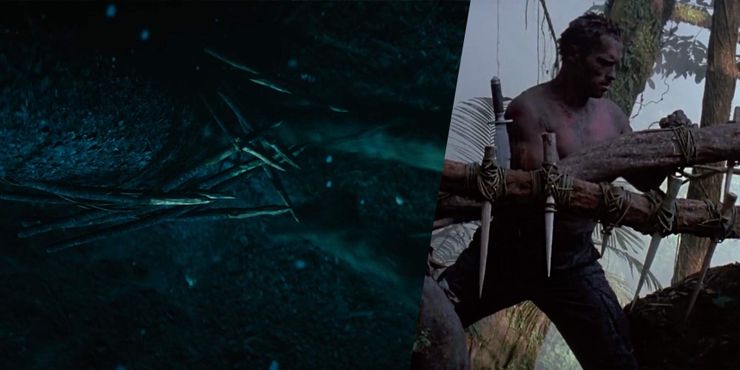 Las trampas de Naru no son tan inmersivas y robustas como en el original. Depredador película, pero ella hace un esfuerzo concertado para construir unos pocos. Uno de ellos incluye algunas púas afiladas talladas en madera, que es un huevo de Pascua que hace referencia a una de las mismas cosas que el holandés de Arnold Schwarzenegger usó al final del original. Depredador. Naru también usa cebo humano, captura a un trampero y le corta la pierna mientras le da un arma para atraer al Predator. Depredador, Dutch se usa a sí mismo como cebo en un punto, lo que hace saltar la primera de sus trampas explosivas. En PresaNaru usa su ingenio y habilidades de manera similar para crear una trampa cuidadosamente tejida para el Depredador que deletrea su perdición.