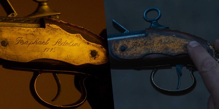 La pistola de chispa de 1715 que Naru roba en Presa from the trappers tiene la misma inscripción que la que un Depredador anciano le dio al personaje de Danny Glover en depredador 2. Esta inscripción dice “Rafael Adolini 1715,” y su historia se ha contado desde entonces en forma de cómic. Se reveló que Raphael Adolini era un capitán pirata que le regaló la pistola a un Predator con su último aliento, diciendo: “tTomalo“la misma línea repetida al personaje de Glover en depredador 2. Este es el huevo de Pascua más grande de Presa de lejos, ya que conecta la película con todo el Depredador franquicia, aunque no está claro si alguna aparición futura reconocerá el origen cómico de la pistola o si tratará Presa como el verdadero comienzo de su viaje.