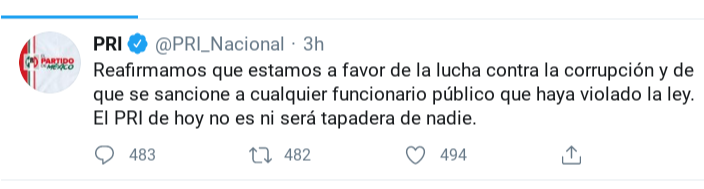 A través de sus redes sociales, el Partido publicó un breve mensaje mensaje en el que afirma que está “a favor de la lucha contra la corrupción y de que se sancione a cualquier funcionario público que haya violado la ley”.