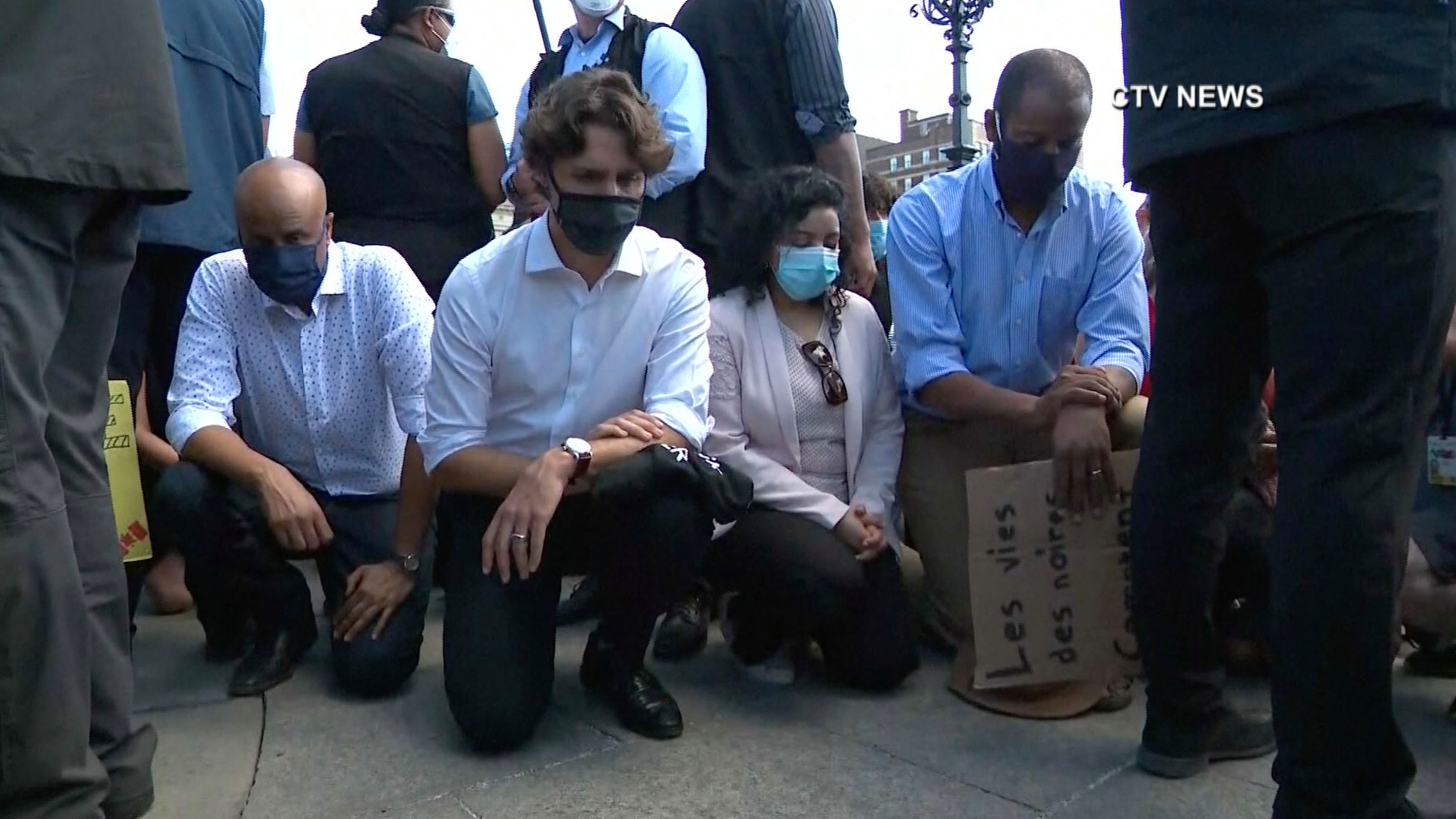 Trudeau, con una mascarilla de tela negra, llegó al Parlamento en Ottawa acompañado de guardias de seguridad. Después de que algunos manifestantes se lo pidieran, se arrodilló, tras lo cual le agradecieron. Inclinó la cabeza mientras los participantes coreaban “Black Lives Matter” (Las vidas negras importan).