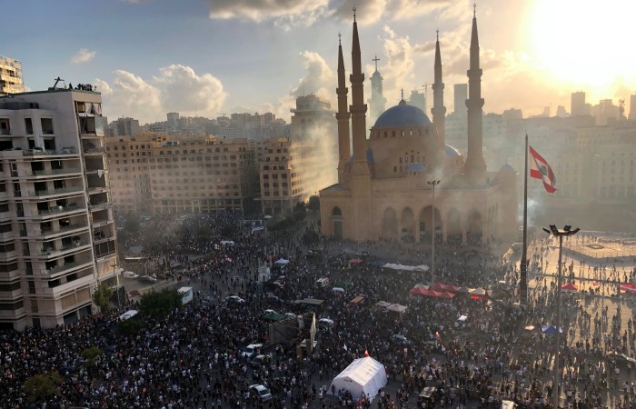 Miles de personas congregadas en la Plaza de los Mártires de Beirut piden “venganza” contra la clase gobernante de políticos a quienes culpan por la explosión en el puerto de Beirut.