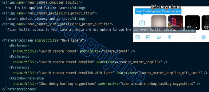 Mientras tanto, buscadores de códigos y frecuentes tipógrafos de TechCrunch. Jane manchun wong ha encontrado un código de Twitter que describe cómo los usuarios deben "probar la cámara de Twitter actualizada" para "capturar fotos, videos y publicarlos". Bloomberg y CNBC informaron previamente que Twitter estaba construyendo una cámara mejorada, pero sin detalles de funciones o capturas de pantalla.