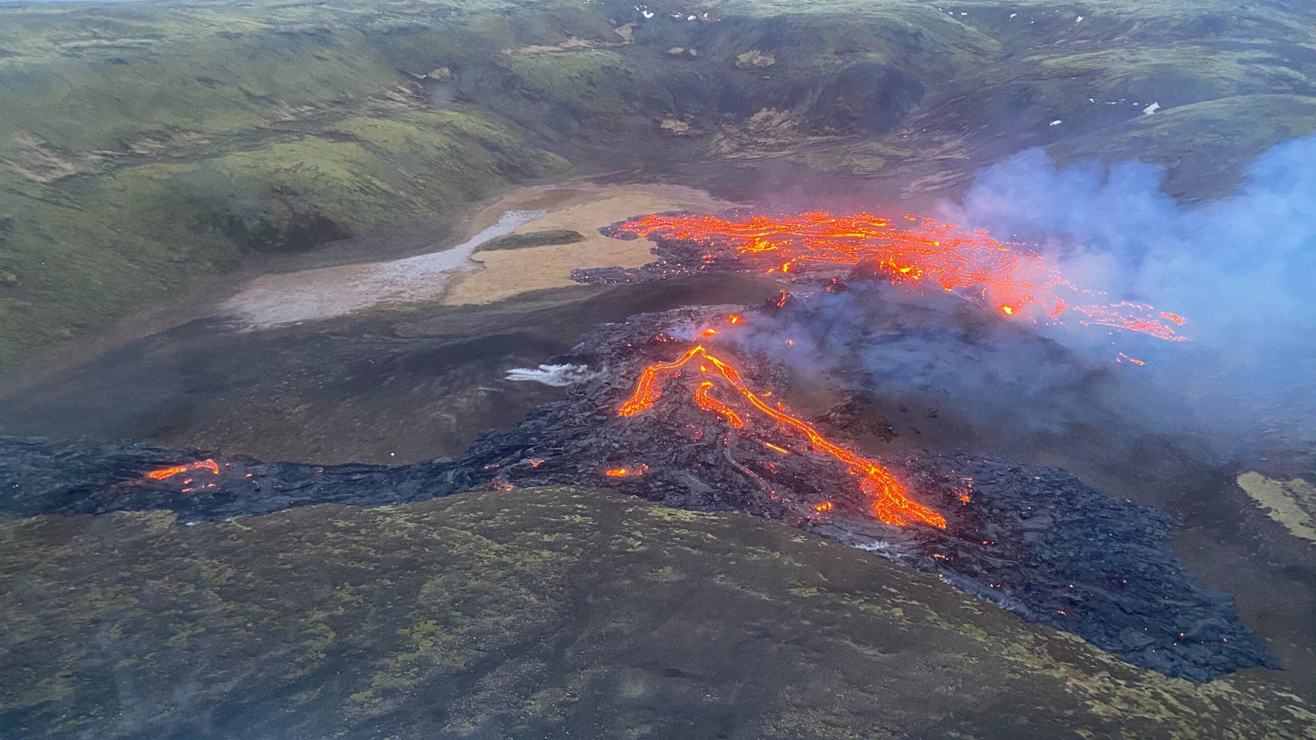 Los científicos sobrevolaron la erupción del valle de Geldinga el sábado por la mañana y estimaron que la fisura eruptiva tenía unos 1,640 pies. Las dos corrientes de lava estaban a unos 2.5 kilómetros de la carretera más cercana.