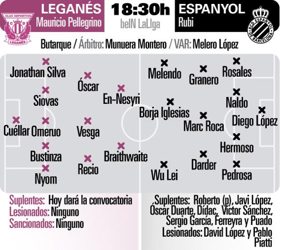 Rubi no hará muchos cambios en el once respecto al que venció a los colchoneros, teniendo en cuenta que repite convocatoria. Todo apunta a que colocará al once de gala contra el Leganés de Pellegrino. Hay que tener presente que no dispone de los lesionados David López y Pablo Piatti. Dos piezas importantes. Pero todos se han conjurado para lograr el triunfo.