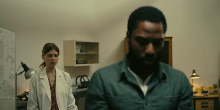 Es excelente aquí con lo que le dan, y es tan increíblemente sofisticado y parecido a Bond, como lo es John David Washington. Esta línea que se refiere al accidente aéreo se entrega de manera memorable, y es ayudada por cuánto se usa antes de la película.