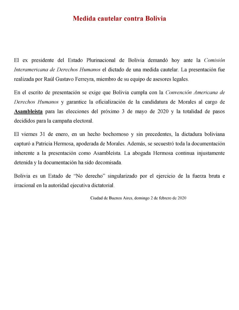 Frente a la persecución, pido a todas y todos los bolivianos mucha responsabilidad y unidad.#DictaduraEnBolivia— Evo Morales Ayma (@evoespueblo) February 2, 2020