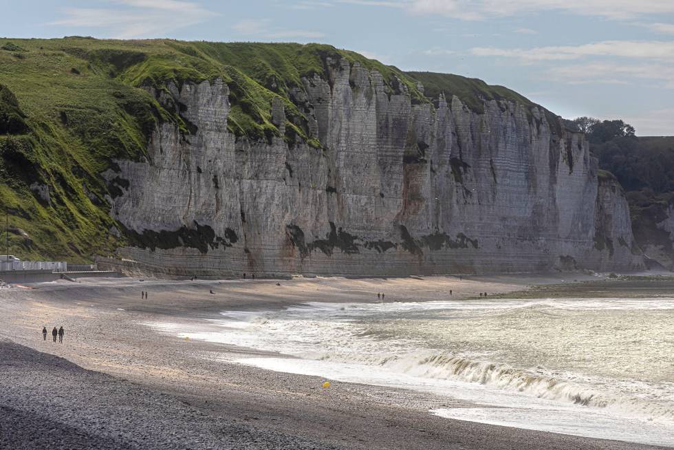 Esta ruta comienza en la llamada Costa de Alabastro, en concreto en el sendero que sigue su contorno a vista de pájaro, al este de la localidad francesa de l’Étretat. El sol junto con las nubes va dibujando el paisaje que domina estos acantilados, grises a contraluz, increíblemente blancos iluminados por el sol o amarillos al atardecer. No es de extrañar que estos parajes hayan atraído a artistas de todas las disciplinas, no solo pintores, también compositores y escritores han encontrado inspiración en este rincón de Normandía: de Édouard Manet a Claude Debussy pasando por el poeta Guy de Maupassant. Al mirar hacia abajo, los rectos acantilados que a veces terminan en cuevas o arcos van a dar a playas de imposible acceso en días de mar furioso y marea alta. Podemos costear hasta Fécamp en un largo paseo de 17 kilómetros sin apenas desnivel. Allí es donde se encuentran los acantilados de mayor altura, y al ver a lo lejos un paseante sobre los valiosos cantos rodados o un kitesurf haciendo piruetas es cuando realmente se aprecia su enormidad.