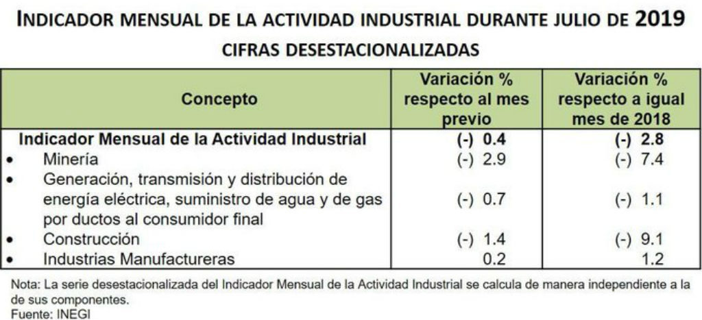Con cifras originales, la producción industrial disminuyó 1.9 por ciento en julio de 2019 respecto a igual mes del año pasado, su noveno mes con caídas a tasa anual, mientras que en los primero siete meses acumula una caída de 1.8 por ciento a tasa anual.