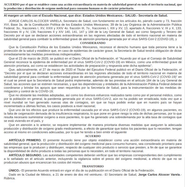 “El presente Acuerdo tiene por objeto establecer como una acción extraordinaria en materia de salubridad general, que la producción y distribución del oxígeno medicinal para consumo humano, sea considerado prioritario para las empresas que lo producen y distribuyen, respecto de cualquier otro producto o servicio que presten, a fin de que se garantice la disponibilidad de dicho producto a todas las personas que lo necesiten, en todo el territorio nacional”, enuncia el artículo primero del acuerdo.