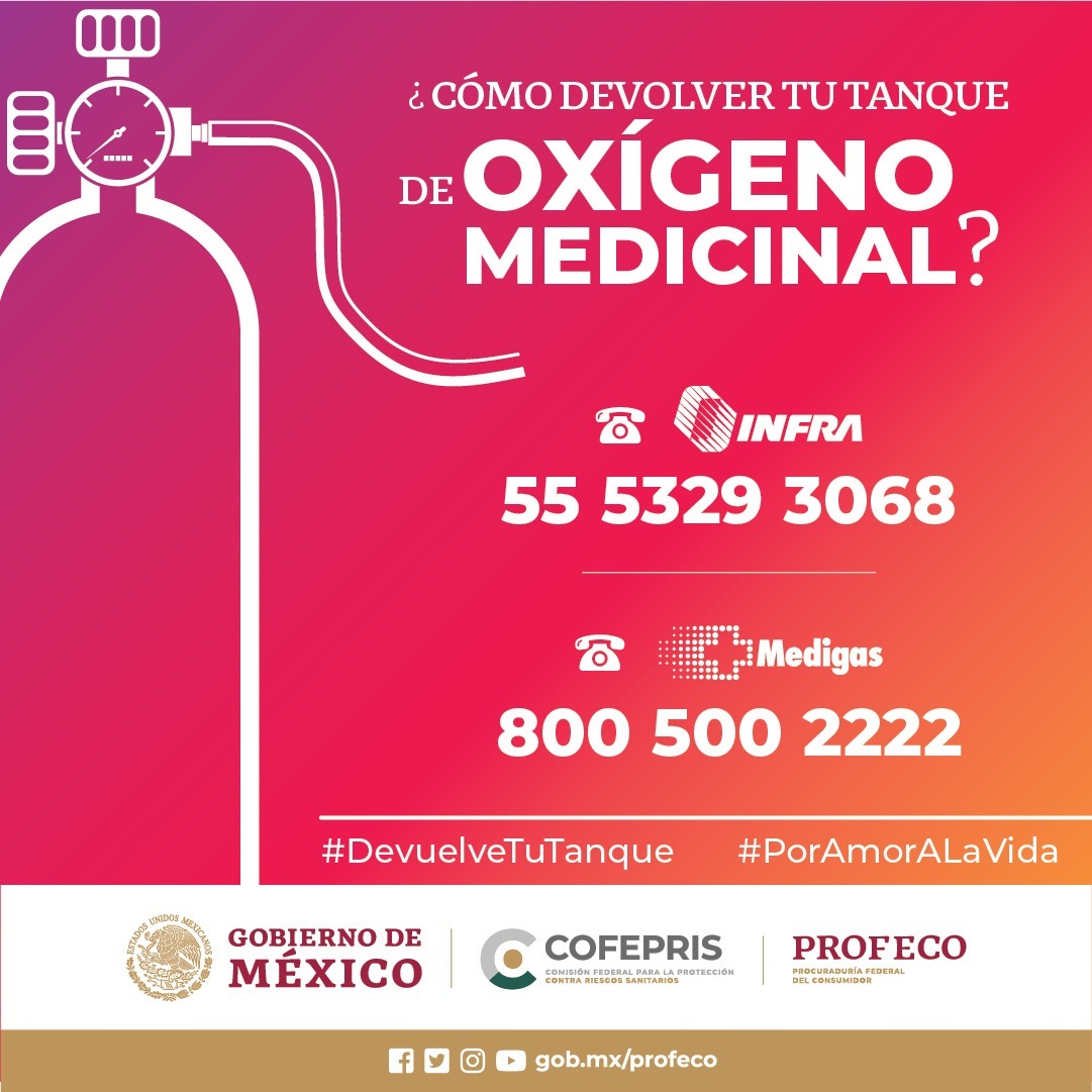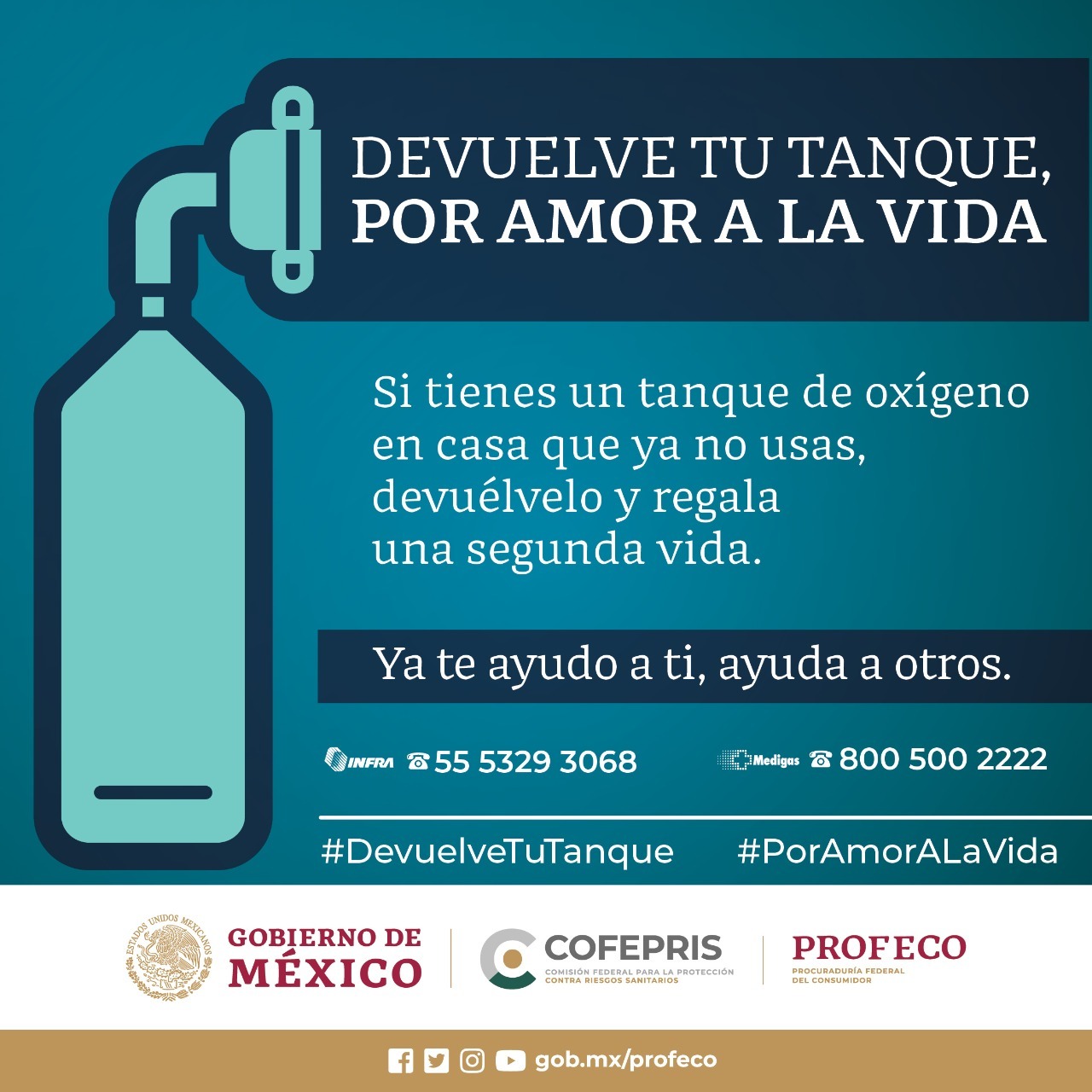 La Procuraduría Federal del Consumidor (Profeco), en colaboración con la Comisión Federal para la Protección contra Riesgos Sanitarios (Cofepris) de la Secretaría de Salud, y las empresas productoras y distribuidoras de oxígeno medicinal Grupo Infra y Medigas, dieron inicio este lunes la campaña “Devuelve tu tanque. Por amor a la vida”.