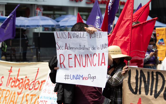Profesores y estudiantes de la Universidad Nacional Autónoma de México (UNAM) marcharon este sábado desde el Ángel de la Independencia al Zócalo de la Ciudad de México -en el marco del Día Internacional del Trabajo- con el fin de que se resuelvan definitivamente los adeudos salariales y exigir la dignificación laboral de los profesores de asignatura y a ayudantes de profesores.