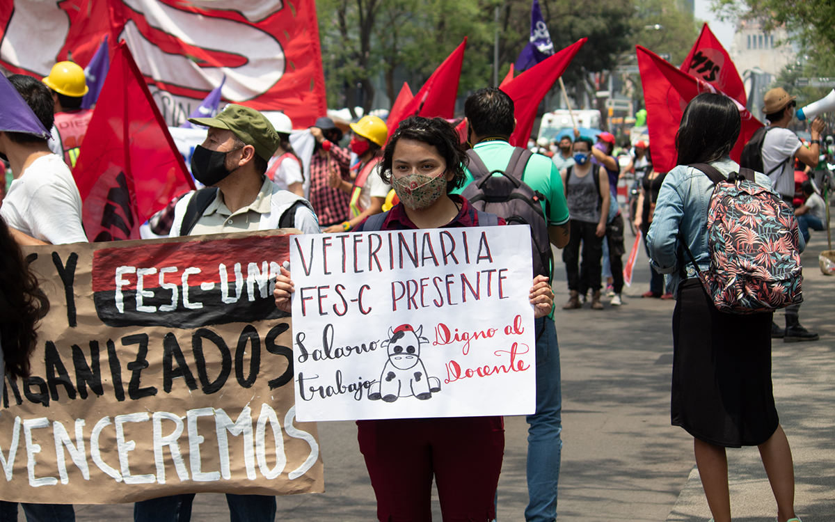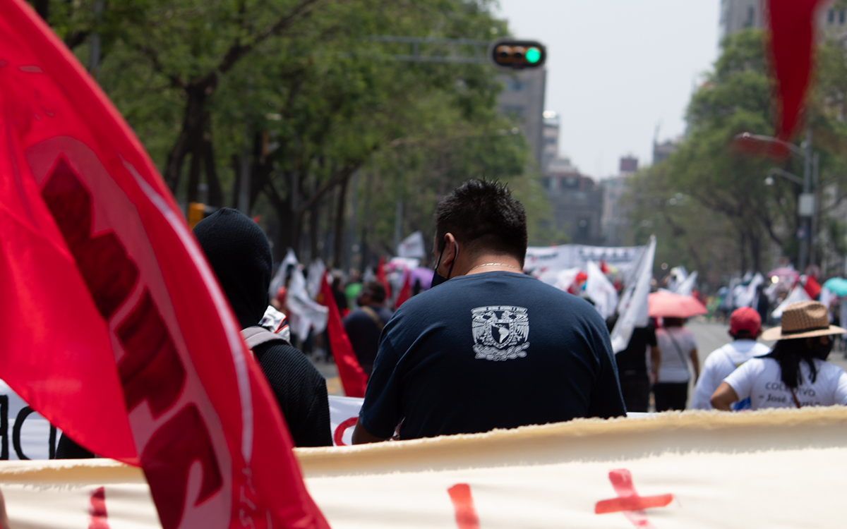 Profesores y estudiantes de la Universidad Nacional Autónoma de México (UNAM) marcharon este sábado desde el Ángel de la Independencia al Zócalo de la Ciudad de México -en el marco del Día Internacional del Trabajo- con el fin de que se resuelvan definitivamente los adeudos salariales y exigir la dignificación laboral de los profesores de asignatura y a ayudantes de profesores.