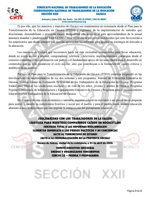 La sección 22 de la CNTE a través de una misiva dio a conocer que el programa nacional “Aprende en casa”, implementado por la Secretaria de Educación Pública (SEP) en medio de la emergencia sanitaria por el Covid-19, no garantiza el acceso a la educación porque la mayor parte de las comunidades y los hogares de México, entre ellos Oaxaca, no gozan del servicio de internet y electricidad, por lo que lo calificaron como “un fracaso”.
