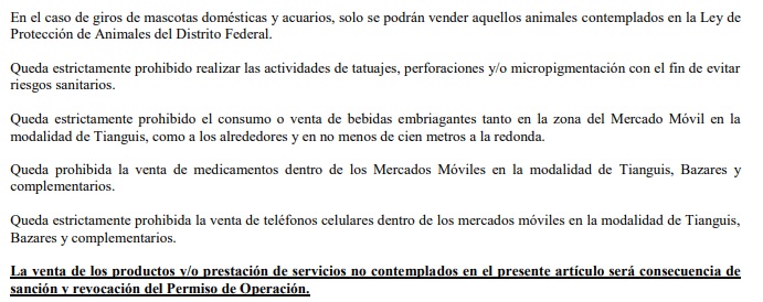 En los Lineamientos de Operación de Mercados Móviles en la modalidad de Tianguis, Bazares y Complementarios en la Ciudad de México, publicados en la Gaceta Oficial, se establece que: