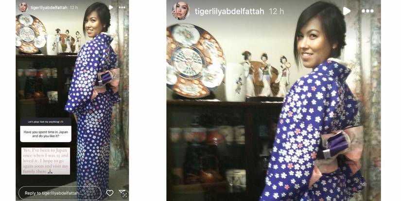 Como Tigerlily es mitad japonesa, uno de sus seguidores quiso saber si ha pasado tiempo en Japón y si le ha gustado. “Sí, he estado en Japón.”, dijo Tigerlily, que había estado allí una vez. Ella reveló que tenía 15 años en ese momento y le encantó la experiencia. lirio de tigre espera volver a Japón para visitar a su familia allí. Parecía una muñeca en su foto antigua con un kimono azul oscuro mientras estaba parada junto a una vitrina llena de curiosidades.