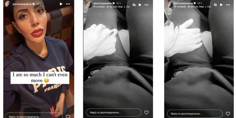 Jazmín aparentemente siente la presión de hacer oficial su nuevo romance en Instagram. Recientemente publicó una foto de ella sentada en un restaurante con la leyenda: “Comí tanto que ni siquiera puedo moverme..” La siguiente historia de Jasmine fue una video que muestra sus muslos con la mano de un hombre apoyada en su muslo izquierdo y acariciándolo. Jasmine tomó la mano del hombre mientras él mordía algo en sus mallas. Jasmine se acercó para mostrar que era un pequeño agujero y el hombre estaba tratando de arruinar aún más las mallas estirando sugerentemente el agujero.