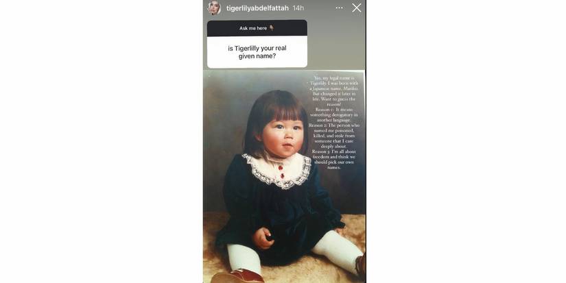 El nombre de Tigerlily solía ser Mariko. Al contarles a los fans la razón por la que lo cambió, quería que adivinaran el motivo. Tigerlily reveló que su nombre significaba algo despectivo en otro idioma. “marico,”en español es una jerga despectiva para un hombre homosexual en español. Además, la persona que la llamó Mariko también fue alguien que lastimó a Tigerlily. Ellos “envenenado, asesinado y robado”de alguien que le importa profundamente. Explicó que la persona no era ninguno de sus padres.
