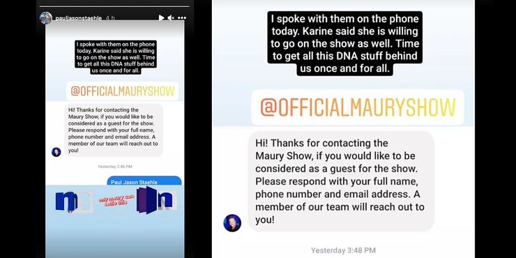 Paul ahora ha decidido participar en otro reality show de televisión que lo ayudaría a determinar si Pierre y Ethan son sus hijos. Ha solicitado estar en El show de Maury Povich, un programa de entrevistas que trata sobre problemas familiares complejos. La ex estrella de TLC compartió una captura de pantalla de su conversación en la que la gente del programa de Maury le pidió que compartiera sus detalles. Paul dijo Prometido de 90 días fans que les habló a través de una llamada telefónica, y Karine también aceptó estar en el programa. Paul escribió: “Es hora de dejar atrás todo este material del ADN de una vez por todas.