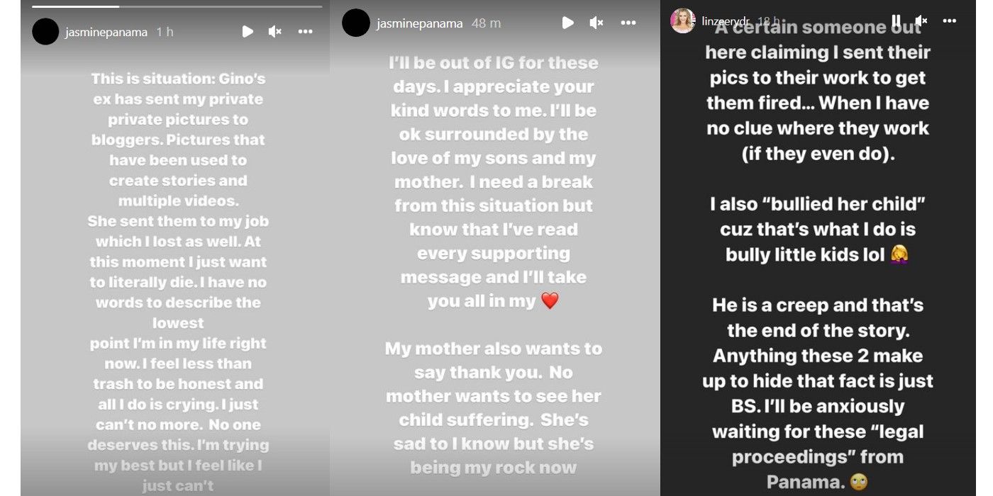 En febrero de 2022, Jasmine compartió una historia de Instagram: “Estoy en el punto más bajo de mi vida. Siento que hoy ya no puedo más.” Jasmine afirmó: “Esto es [the] Situación: El ex de Gino ha enviado mis fotos privadas a blogueros. Imágenes que se han utilizado para crear historias y múltiples videos. Ella los envió a mi trabajo, que yo también perdí.“ Jasmine escribió que se sentía “menos que basura”Y lo único que pudo hacer fue llorar. Jasmine dijo que estaba haciendo lo mejor que podía pero que se tomaría un descanso de Instagram por unos días. Jasmine notó que quería un descanso de la situación. Agradeció a sus fans por su apoyo.