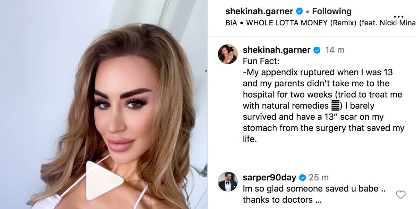 - Shekinah Garner de Prometido de 90 días: The Other Way comparte una experiencia médica de su infancia que puso en peligro su vida: su apéndice se rompió cuando tenía 13 años y sus padres no la llevaron al hospital durante dos semanas.