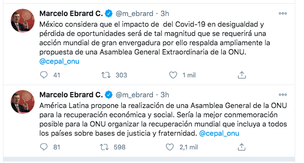 El canciller Marcelo Ebrard formalizó la propuesta  de realizar una Asamblea General de la ONU de forma extraordinaria, para abordar la recuperación económica y social en medio de la pandemia por Covid-19.