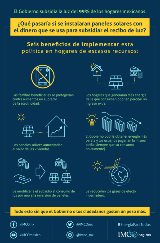 Asimismo, el IMCO indicó que las familias estarían protegidas ante los aumentos de las tarifas, además de la posibilidad de tener ingresos extras por la venta a la red de la electricidad adicional generada.