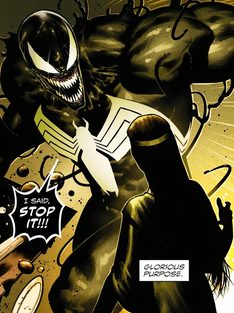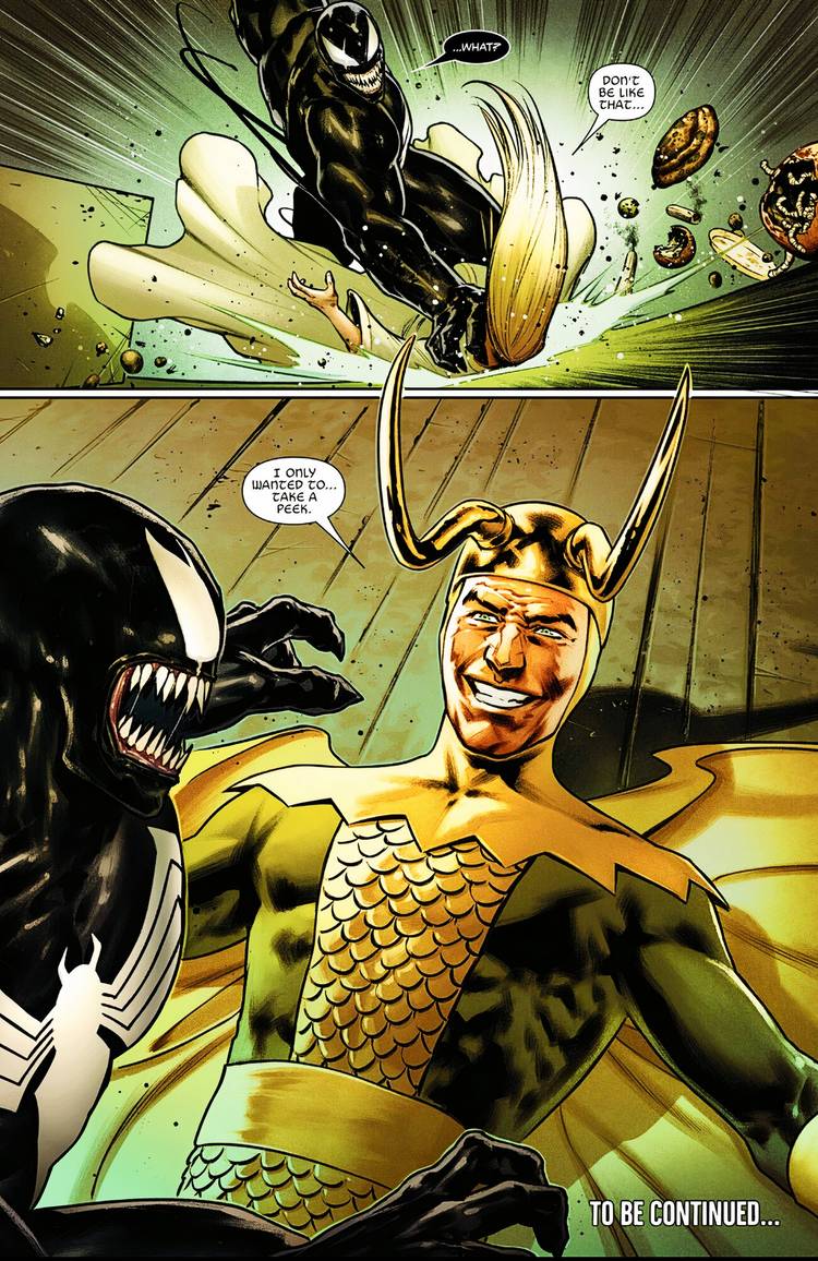 Mientras explora la mente de Venom en la escena final del número, el narrador Loki afirma que esta versión de Venom está impulsada únicamente por “un propósito,” antes de agregar “un propósito glorioso” – en lo que es a la vez una devolución de llamada directa y una preparación para el clímax de este arco actual.