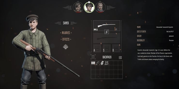 Contras: El tirachinas de Sanek es genial cuando funciona, pero hay un problema en el que a veces simplemente falla, incluso cuando se actualiza a Slingshot II. Más tarde en partisanos 1941, su habilidad de disfrazarse se vuelve menos confiable, ya que más enemigos pueden ver a través de ella. Una vez que estalla una pelea, Sanek no es la mejor opción, ya que hasta que sea un partisano experto no tiene forma de mejorar sus habilidades con el rifle. Con solo una escopeta para mantenerlo a salvo, los enemigos pueden golpearlo fácilmente desde la distancia, a veces incluso si está a cubierto.