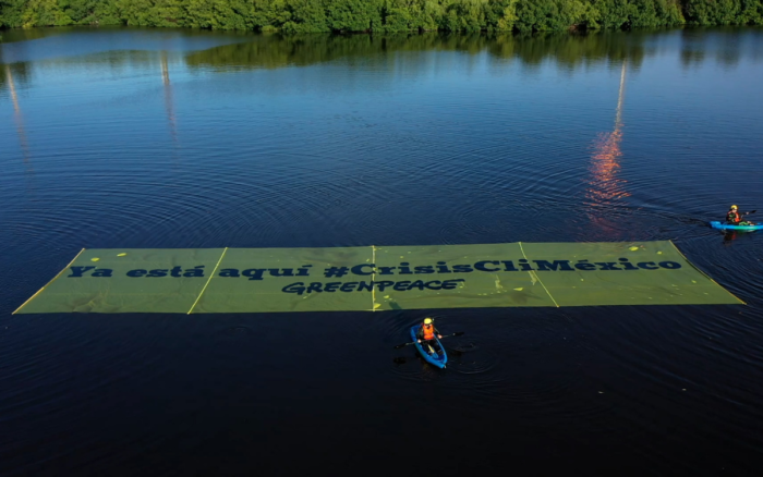 Activistas de Greenpeace México desplegaron una manta acuática de seis por 25 metros en las inmediaciones del complejo energético de Torno Largo y Dos Bocas para exhibir que el cambio climático no ha sido una prioridad en las agendas políticas ni de esta administración ni de las anteriores.