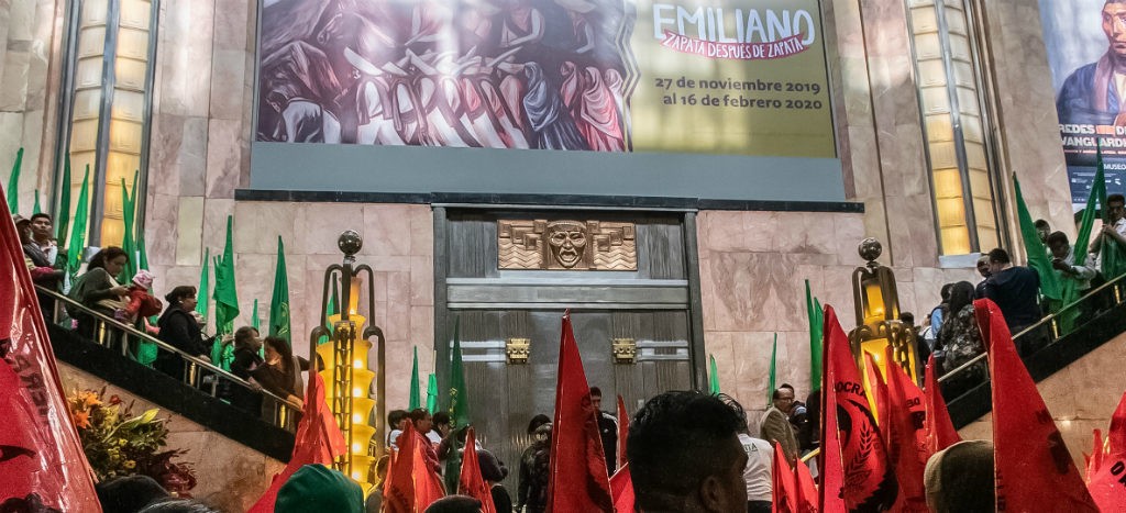 Campesinos de la Unión Nacional de Trabajadores Agrícolas (UNTA) se manifiestan en Bellas Artes contra la exposición “Emiliano Zapata después de Zapata”, que incluye una pintura en la que se ve al general desnudo montado sobre un caballo, con zapatillas y sombrero rosa.