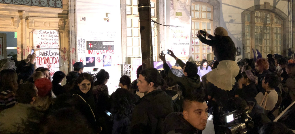 Un grupo de mujeres activistas integrantes de varios colectivos protestaron en la Casa Chihuahua, en la colonia Roma de la Ciudad de México, para exigir justicia en el feminicidio de Isabel Cabanillas.