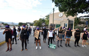 Unas 50 jóvenes vestidas de negro y morado, integrantes de diversas organizaciones, acudieron a un llamado en redes sociales para protestar en Chilpancingo contra Salgado Macedonio, precandidato de Morena a la gubernatura de Guerrero.