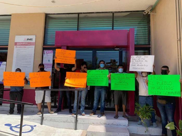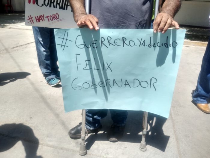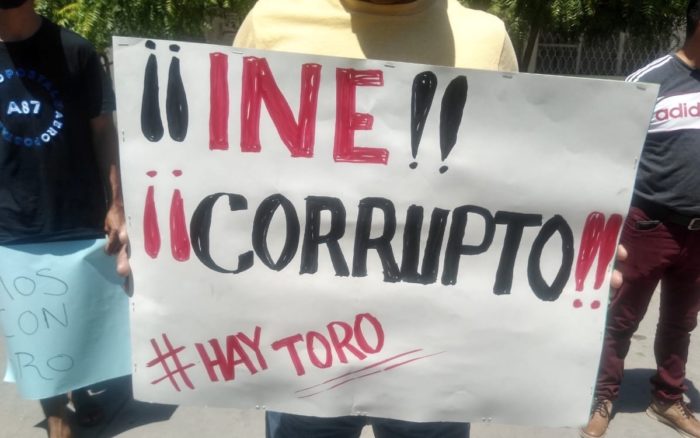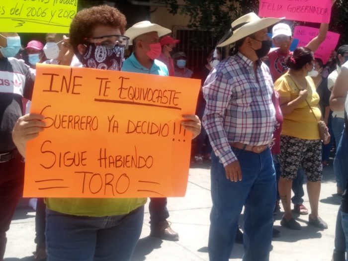 En las protestas en Altamirano se observaron pancartas en las que se lee “INE te equivocaste. Guerrero ya decidió. Sigue habiendo Toro” (como le llaman al candidato), además de que califican de “corrupto” al órgano electoral por haber tomado la decisión de anoche.