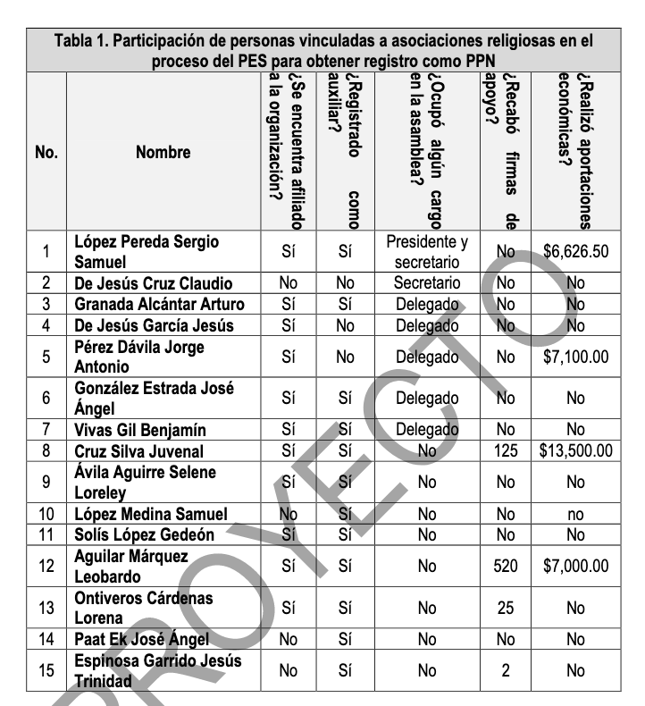 En este caso en particular, el proyecto apunta la participación de personas con “investidura religiosa”, de las cuales: 11 están afiliadas al PES, 12 fungieron como auxiliares para recabar apoyo, 7 ocuparon cargos en el desarrollo de las asambleas estatales, tras recabaron 647 registros de ciudadanos y cuatro aportaron 34 mil 226 pesos.