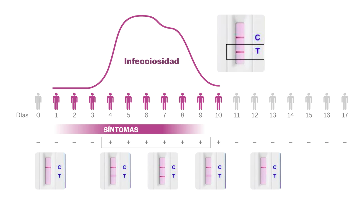 El protocolo en España indica que hay que comenzar un aislamiento de siete días desde el inicio de los síntomas, o en caso de los asintomáticos, del positivo, independientemente de que se sospeche que este se produjo en un estado de la infección más precoz o más tardío, sea la segunda línea más clara o más oscura.